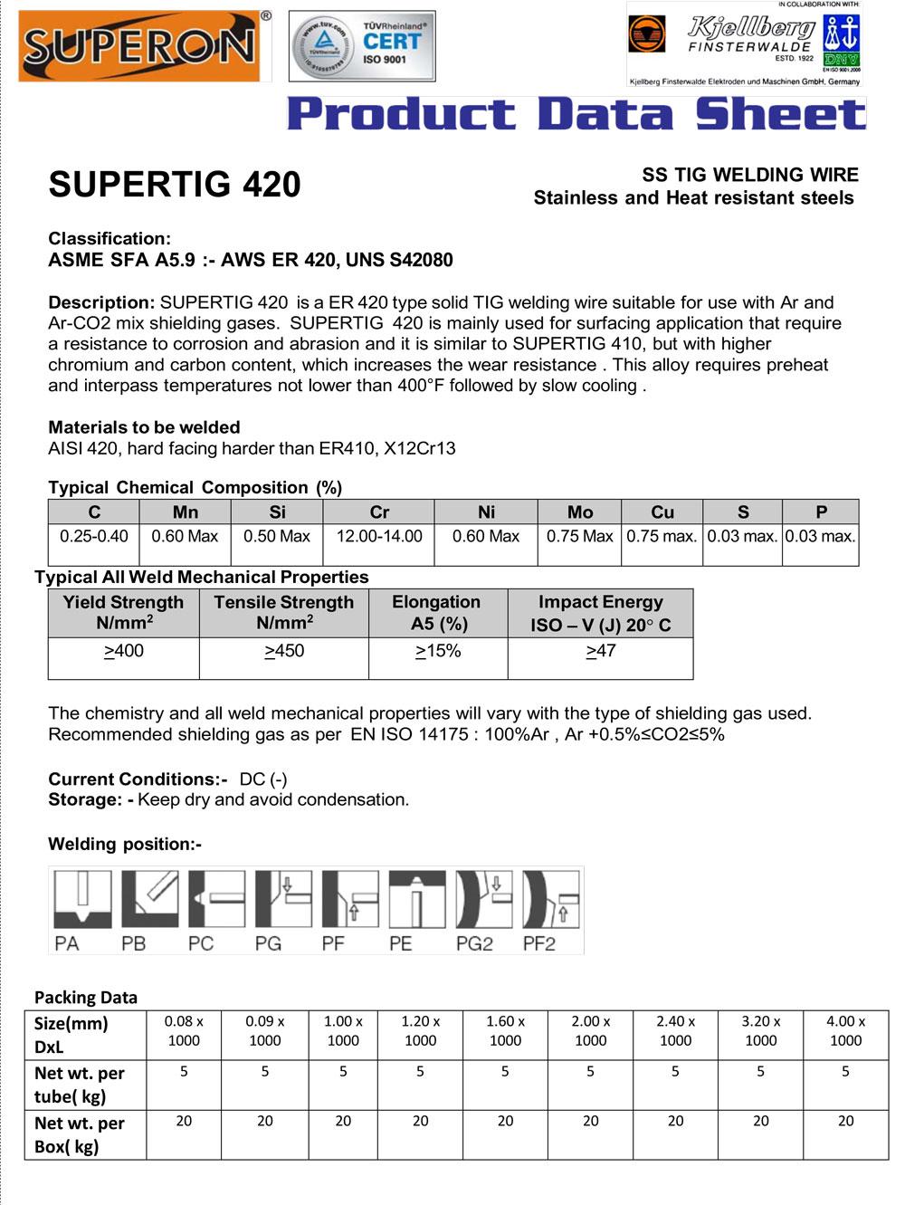 ลวดเชื่อมอาร์กอนสแตนเลส SUPERON SUPER TIG 420 (ER420) เหมาะสำหรับงานเชื่อมพอกผิวชิ้นงานเพิ่มความแข็งแรงของพื้นผิวลดการซึกกร่อน หรือเชื่อมงานต่อชน วาล์วก๊าซ วาล์วน้ำ ระบบท่อสตีมสแตนเลสเกรด 420 สามารถทนอุณภูมิสูงถึง 450 องศาเซลเซียล